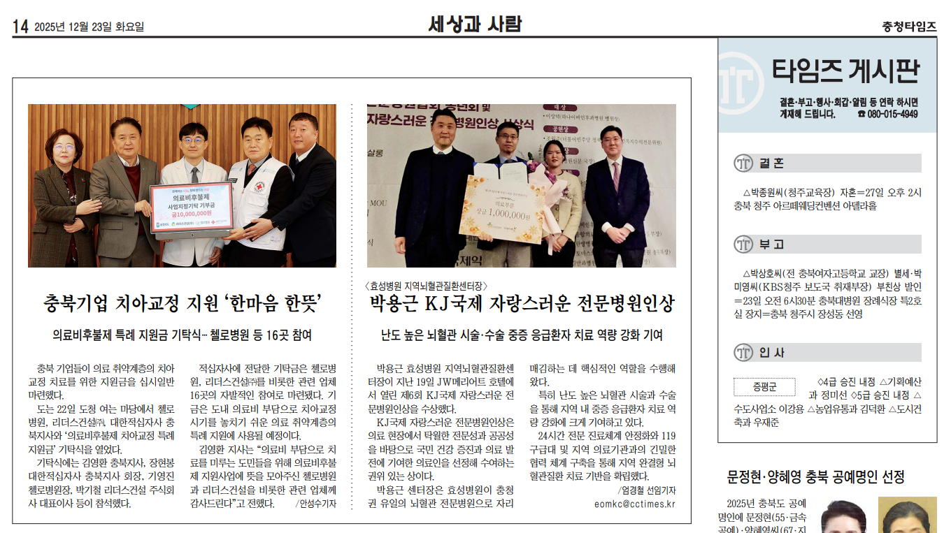 박용근 충북 청주효성병원 지역뇌혈관질환센터장이 ‘6회 KJ국제 자랑스러운 전문병원인상’을 수상했다.